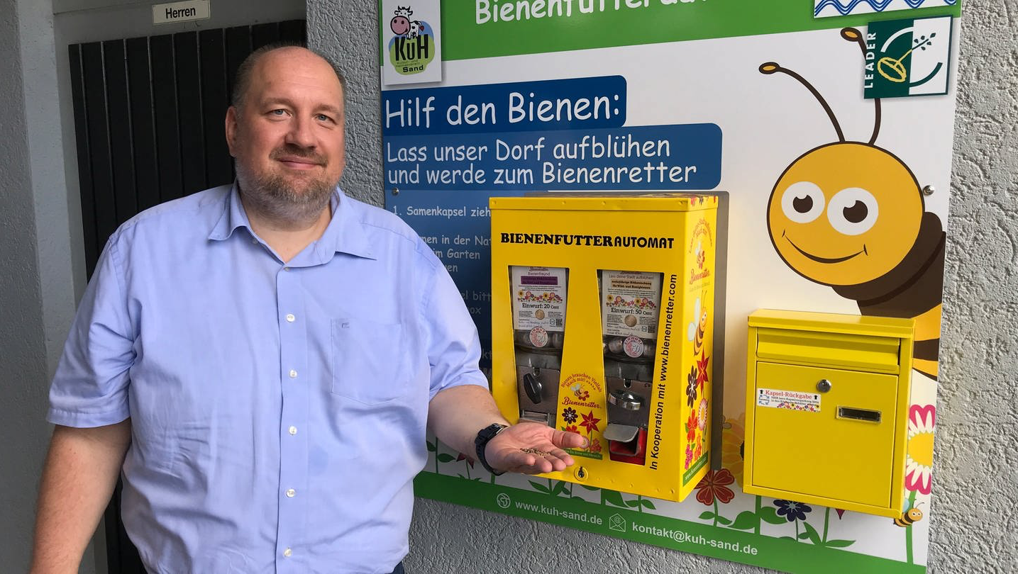 Darum geht's: Der "Bienenretterautomat" gibt kleine Kapseln mit Wildblumensamen aus, die dann in der Natur oder im heimischen Garten ausgesät werden können. Die Blüten der Blumen dienen dann als willkommene Nahrungsquelle für die heimische Bienenwelt und tragen so zum Erhalt der heimischen Bienenarten bei.